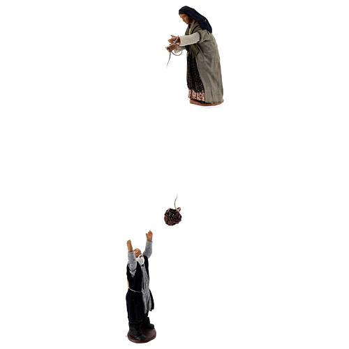 An original and impressive idea, perfect for Nativity scenes arranged on different levels is the scene of the basket: an old woman lowers a basket tied to a rope to a man who raises his arms to welcome it. The scene is really beautiful and will be of great effect if we have the opportunity to place the figurines in such a way that one is on a higher floor and the other below.
