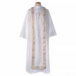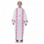 Fabrics range from cotton to polyester, the colour is almost always white, in all its shades, ranging from ivory to ice white. The embroideries offer a wide range of variations, from simple golden borders that adorn the hem of the dress and the sleeves, to more complex embroideries, in the shape of a cross, for example, covering the entire chest. Some of our First Communion dresses are also enriched by a scapula, a strip of cloth with an opening for the head, that rests on the chest and the back, which some religious orders wear over the priestly garment, edged in gold or decorated with embroidery. Others have additional decorative elements, like this model, embellished by a stole on which honeycomb cross is embroidered. Still others have the edges embellished with gallons, trimmings shaped like a crushed ribbon made of interlaced silk threads, usually gold or red.
