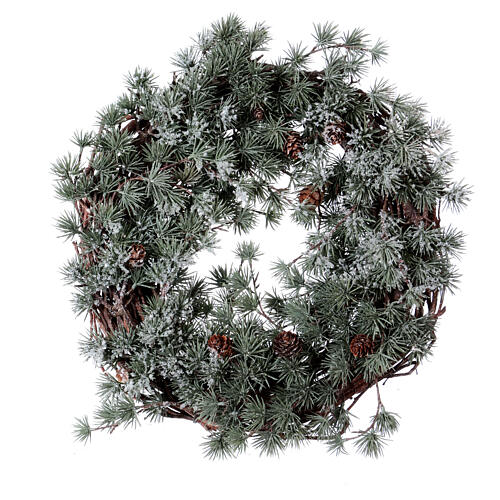 Advent wreath in fake frozen larch with real pine cones and wooden base. It is possible to add spherical or cylindrical candles to use it as and advent wreath or it can be hanged to the wall.