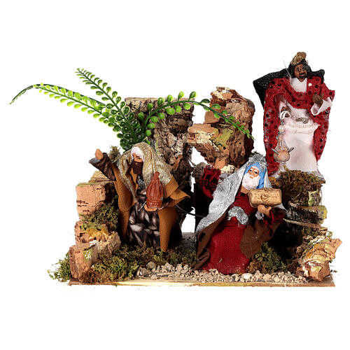 Wise Men in motion for Nativity Scene with 12 characters 23x18x21 cm. Setting with animated characters, representing a naturalistic environment with the Wise Men and their gifts, all made of terracotta and animated by an engine with 220V 1.2W plug.