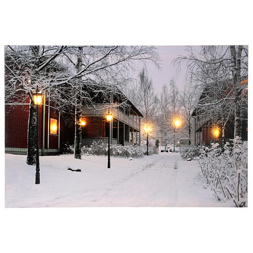 Christmas canvas, LED lights, snowy landscape with houses, 40x60 cm. Christmas wall canvas of 40x60 cm illuminated by LED lights, representing a snowy road with colourful wood houses and lampposts.