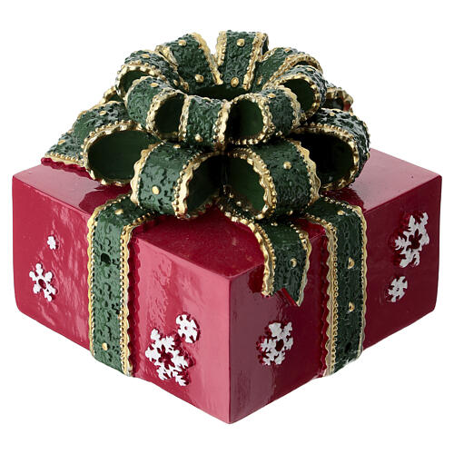 Made of resin in the shape of a wrapped present with decorative ribbon and top bow, reproducing a classic Christmas gift.