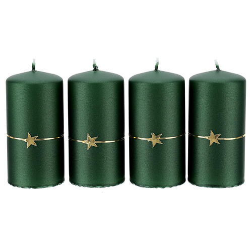 Christmas candles, set of 4, opaque green with golden star, 100x50 mm. Set of 4 opaque green Christmas candles with a golden stripe and a star on it, measuring 10 cm of height and 5 cm of diameter, made in Germany by a specialised company.