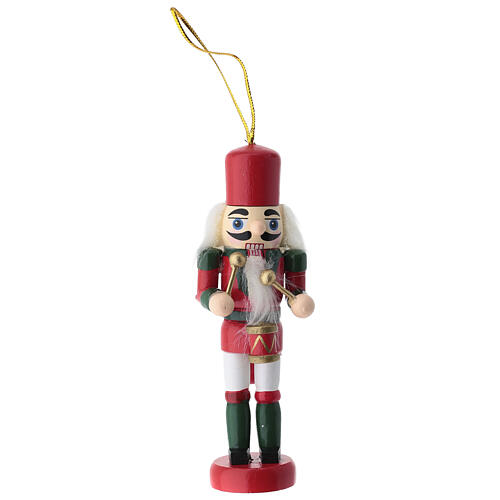 Handcrafted wooden ornament depicting a nutcracker with a front-facing tambourine and drumsticks, dressed in a red and green uniform with a tall hat, and finished with applied beard and hair. The piece has a painted finish that highlights the woodwork details.