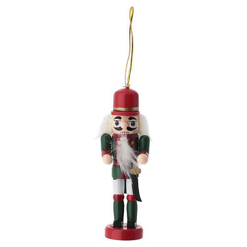 Wooden Christmas nutcracker tree ornament with green and red saber
