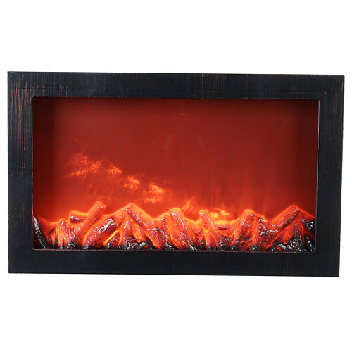 Stove with flame effect LED light 40x60x10 cm. Rectangular black stove of 37x60.5x11 cm with flame effect LED light and fake burning coals, powered by C battery (not included).