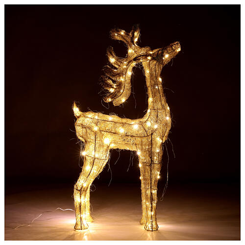 Reindeer with golden wire, 90 warm nanoLED lights, indoor, h 90 cm. Christmas light indoor decoration in the shape of a reindeer made of golden wire with 90 nanoLED lights, warm white, with steady light, powered by an IP20 transformer (included).