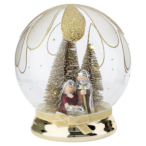 Inside the clear dome, the Nativity Scene unfolds with snow-covered fir trees, enhanced by warm lights that illuminate the setting with a simple touch thanks to the switch located under the base. The golden finish adds a touch of sophistication and brightness, while the glittery petals surrounding the dome emit a soft, shimmering light.