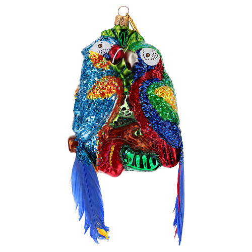 Exquisite blown glass Christmas tree ornament depicting a vibrant pair of tropical parrots.