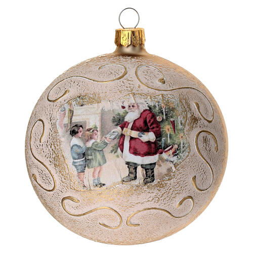 - Box of 4 Christmas balls, opaque gold, Santa with children, 100 mm