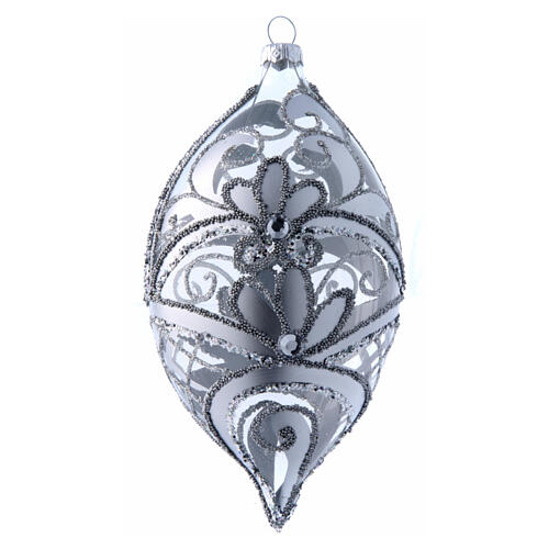 Christmas drop shaped decoration in silver 100 mm. Christmas decoration ideal for the Christmas tree or for the house made in blown glass, according to the traditional technique. The ball is decorated and painted by hand. Each manufact is different from the other: this makes every bauble unique.