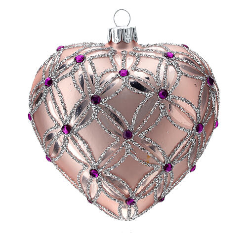 Heart Shaped Christmas bauble in blown glass with pink and violet decorations, with a diameter measuring 100mm.
