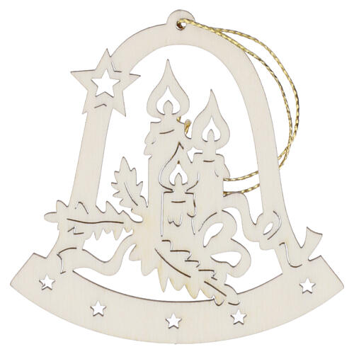 Christmas decoration in finely carved wood representing a bell with candles in the centre.