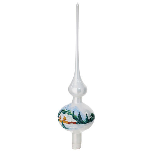 Christmas tree topper of polished white blown glass, snowy houses, 14 in. Topper for Christmas tree made of polished white blown glass and decorated by hand in Poland with a pattern of snowy houses in the woods.