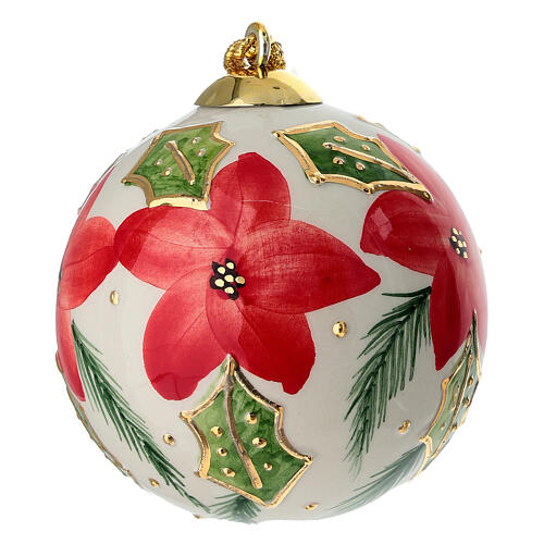 Christmas bauble by Dellarte Ceramiche, light background with red poinsettias and holly, 4 in, hand-painted.