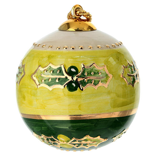 Dellarte Ceramiche hand-painted Christmas ball with holly, ivory background, green stripe and gold details, 3.15 in.