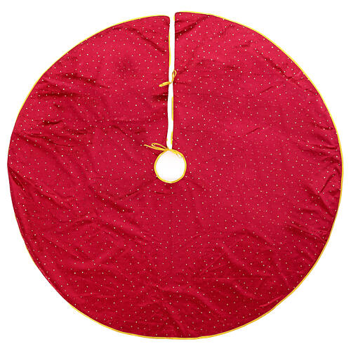 Burgundy velvet Christmas tree skirt, diam. 47 in. Christmas tree skirt made of burgundy velvet with golden laces and small golden printed stars on it.
