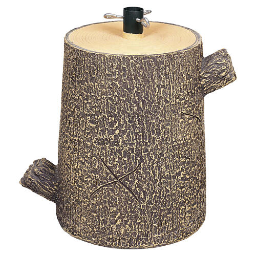 Trunk-shaped base for Christmas tree, with engravings and branches cut to imitate a real tree. This base measures 13-inch in height, 8.7-inch in diameter, featuring a top housing for the Christmas tree. The housing has a diameter of 1.26 in but can accommodate various tree types thanks to the three included screws. By adjusting these screws, the diameter and inclination of the tree pole can be adapted.