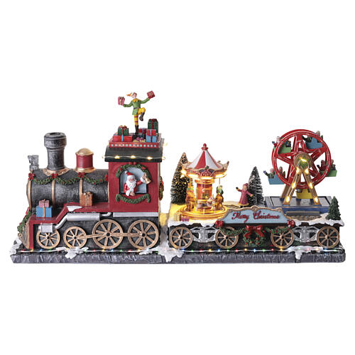 Animated Christmas train with LED lights, elf and carousel, 10x20x6 in