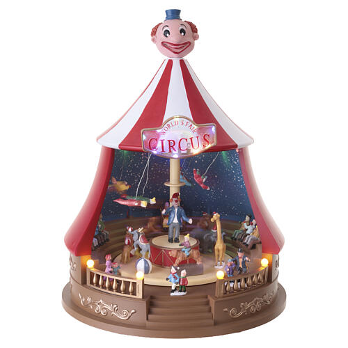 This setting features a circular base shaped like a big-top, illuminated "Circus" sign, a stage with circus performers, animals and suspended figures.