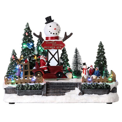Christmas village, Snowman Festival with LED lights, 21.5x30x18 cm. Christmas village set representing the Snowman Festival with a snowman and a red car with Santa in motion.
