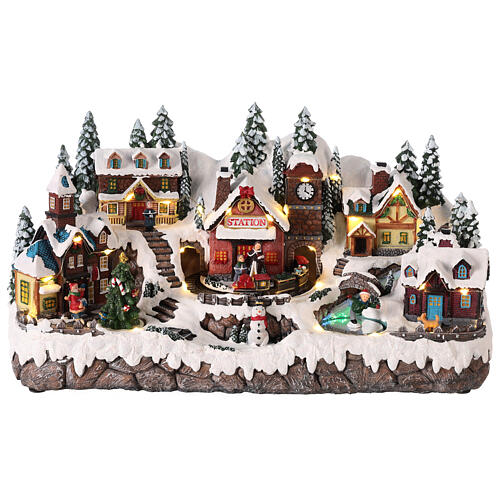 Christmas village with train in motion, snow and LED lights, 25x40x15 cm