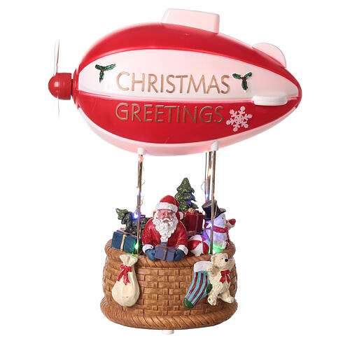 Santa Claus on an airship 28x23x11.5 cm LED. Red and white resin airship with Santa Claus and plastic propellers, suitable for children, illuminated by LED lights.