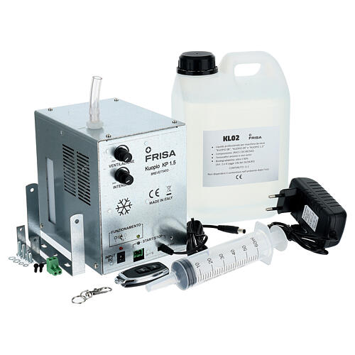 The kit includes everything needed for assembly and operation, including a refueling syringe, mounting brackets, remote control for snowfall on/off, screws, and clamps.