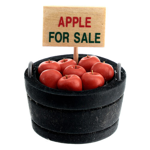 Basket of apples for sale for 12 cm Nativity Scene, h 4.5 cm. Miniature round wooden basket with handles, full of apples and decorated with a sign "for sale". Suitable for Nativity Scene with figurines of 12 cm average height.