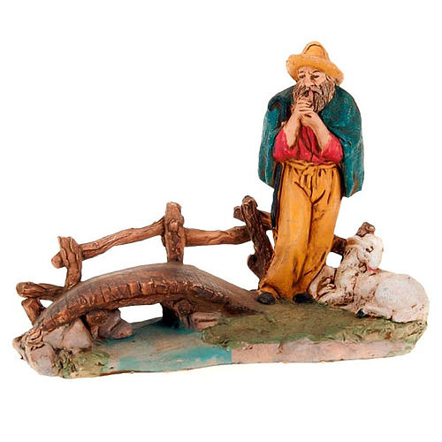 Nativity scene: figurine of a shepherd with sheep on a bridge over a stream. Nativity figurine in plastic on a base. Entirely made in Italy.