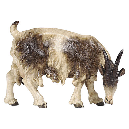 Goat eating with the head to the right for Val Gardena Heimatland Nativity Scene with painted wood figurines of 12 cm. Statuette made of maple wood and painted by hand by Italian craftsmen of the Val Gardena, specialised in wood carving.