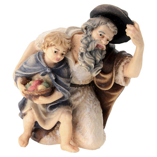 Shepherd on his knees with a child, painted wood, 9.5 cm Heimatland Nativity Scene of Val Gardena. Small statue entirely refined and painted by hand with pastel colours by experienced carvers of the Val Gardena (Italy).