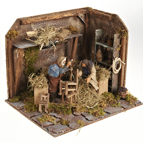 Animated Nativity scene set, 12cm (4,72in). It depicts 2 figurines repairing chairs.