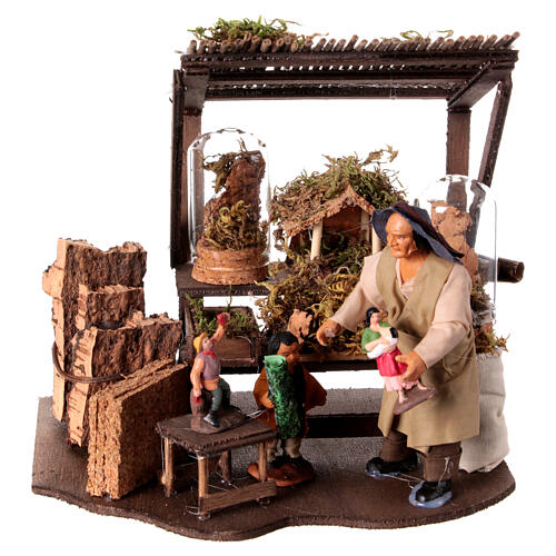 Cribs maker in his workshop with a child for 10 cm Neapolitan Nativity Scene. Setting of 16x16x13 cm representing a cribs maker's workshop with the craftsmen and a child, both made of terracotta and fabric and painted by hand.