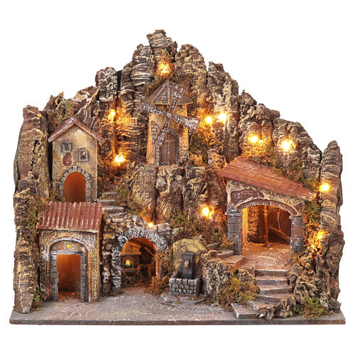 Illuminated village with oven, mill, and fountain for 8-10 cm Neapolitan Nativity Scene, 60x34.5x50 cm.