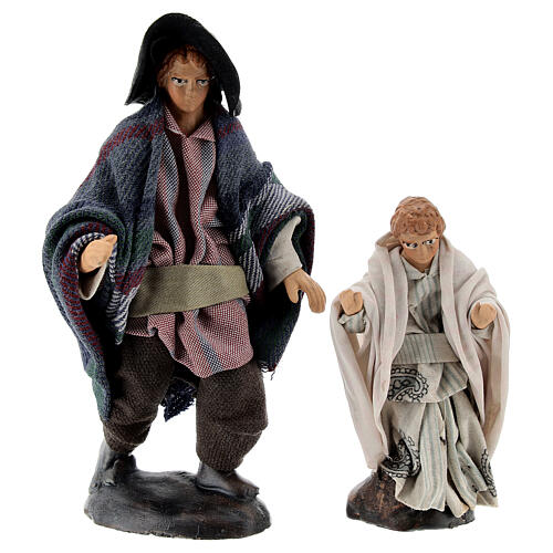 Nativity statue in terracotta and fabric, handmade by Neapolitan nativity craftsmen. Set of two statues, an adult man and a child standing, handmade in terracotta, painted and subsequently covered in fabric, an example of Italian quality and of the Neapolitan nativity tradition.Each statue is unique thanks to the limited availability of fabrics and colors and thanks to the high level of craftsmanship. These statues are ideal for a 12 cm nativity scene. Real heights of 11 cm for the adult and 7.5 cm for the child.