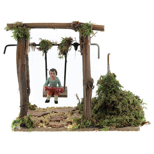 Terracotta swing with painted girl sized 4 cm made in wood and natural moss, and equipped with engine for the movement. The setting includes an electric plug for the engine (1,2 watt 18 cm diameter). It is made in Italy by Neapolitan nativity scene artisans according to the tradition that belongs to the town.