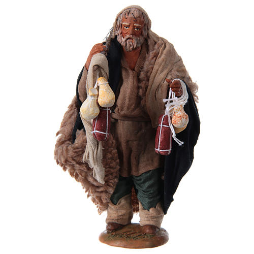 Pilgrim with cold cuts and chees 14 cm: statue made of terracotta typical of Neapolitan nativity scene. This statue depicts a pilgrim with cold cuts and cheeses.