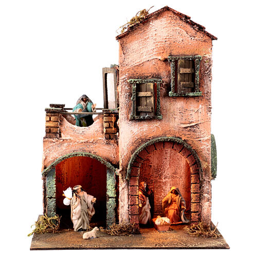 Red house with Nativity and LED lights, Neapolitan Nativity Scene of 6 cm, 30x25x20 cm. Setting with a two-storey red house with arches on the ground floor and a terrace on the first, enriched by characters of 6 cm average height. The figurines represent the Holy Family, a sheep and two other characters.