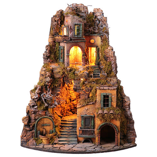 Small village with angular fountain, 70x35x35 cm, for 10-12 cm Neapolitan Nativity Scene. This Nativity Scene setting portrays a small village with a fountain, handcrafted by Neapolitan Nativity Scene artisans. The village is structured on an angular base and features houses with balconies, porches, and indentations, set in a mountainous landscape.