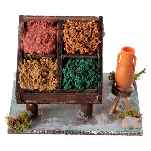 Spice stall for 10 cm Neapolitan Nativity Scene, 5x10x10 cm. Spice stall with wood frame and miniature hand-painted food and details, made by hand in Italy by Neapolitan craftsmen specialised in traditional Nativity Scenes.
