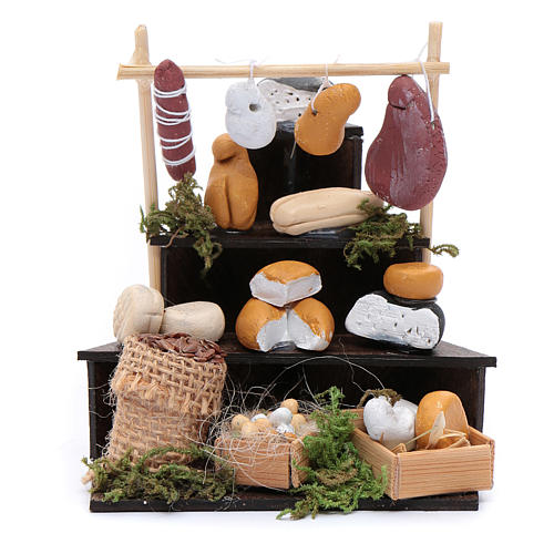 Triangular nativity scene stand on three levels with various cheese shapes and an horizontal axis with cheese shapes hanging. This nativity scene accessory is entirely handmade, the stand is in wood and the cheeses are in terracotta; at the feet of the stand there are a juta bag and some boxes. This article is carefully made by Neapolitan artisans.