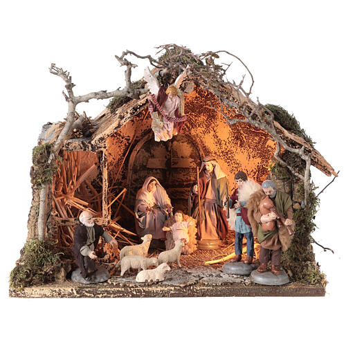 Wood and cork stable for Neapolitan Nativity Scene with 12-14 cm characters, illuminated, 30x40x30 cm