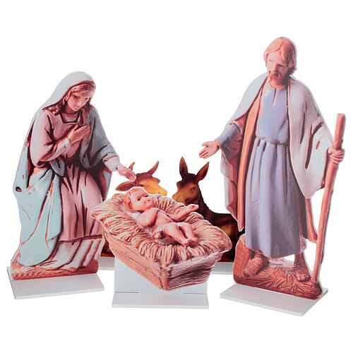Depiction of the Nativity, composed of five forex silhouettes representing the Madonna, Saint Joseph, the newborn Baby Jesus, the donkey, and the ox.