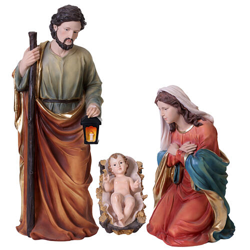 High-quality resin statues depicting the heart of the Nativity. The piece is a stable composition: Saint Joseph stands with his lantern and staff in the role of protector and guide, while the Virgin Mary kneels in humble prayer before the Infant Jesus, who rests serenely in the manger.