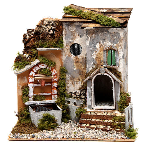 Farmhouse with fountain 24x23.7x21 cm.Farmhouse with fountain and mountains on the background.The item includes a 3-watt water pump with 40-cm hydraulic head and flow rate of 150 litres per hour.Item made in Italy using cork, paper and moss.To activate the pump, connect the plug to a 220V socket.