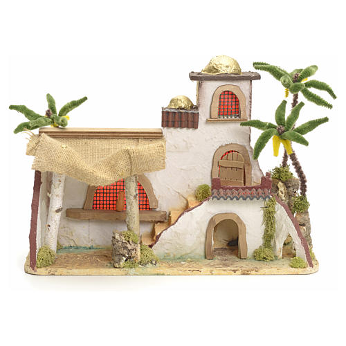 Nativity setting, stuccoed Arabian house with jute and palm curtain measuring 30x43x18cm.