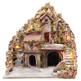 Nativity setting, mountain village with lights, for 10 cm characters, 45x60x35 cm