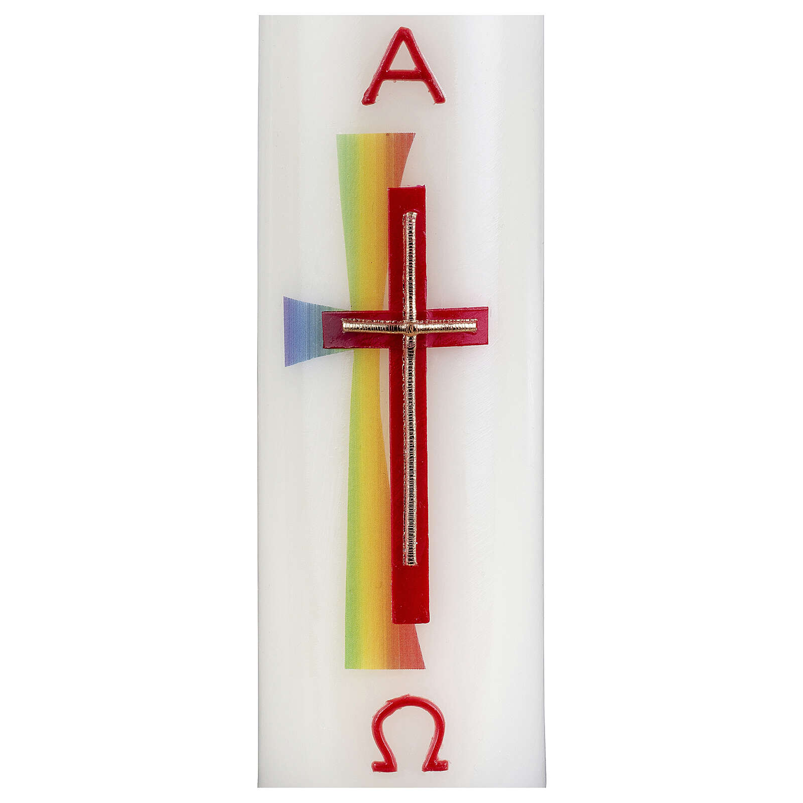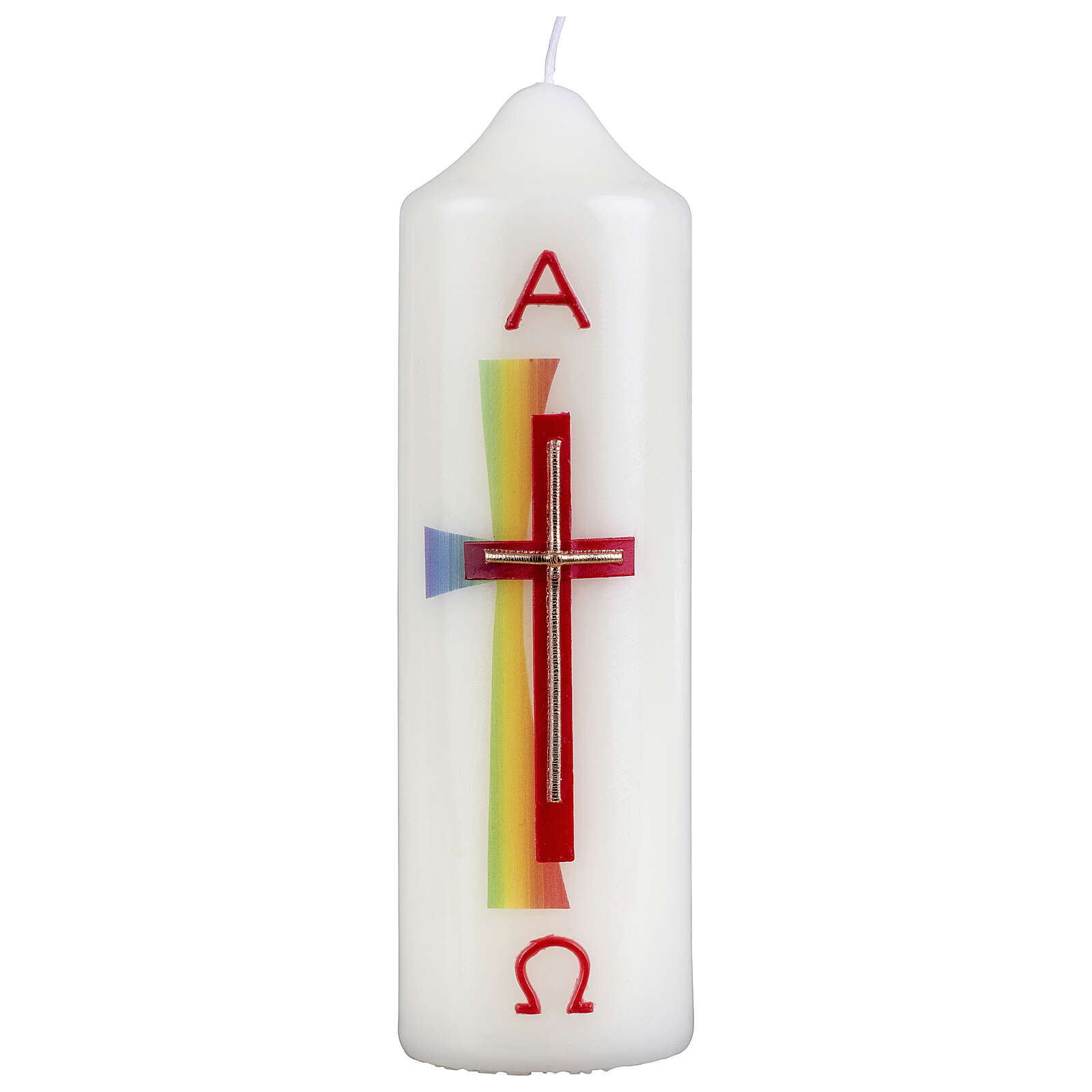Candle with double rainbow cross 16.5x5 cm.