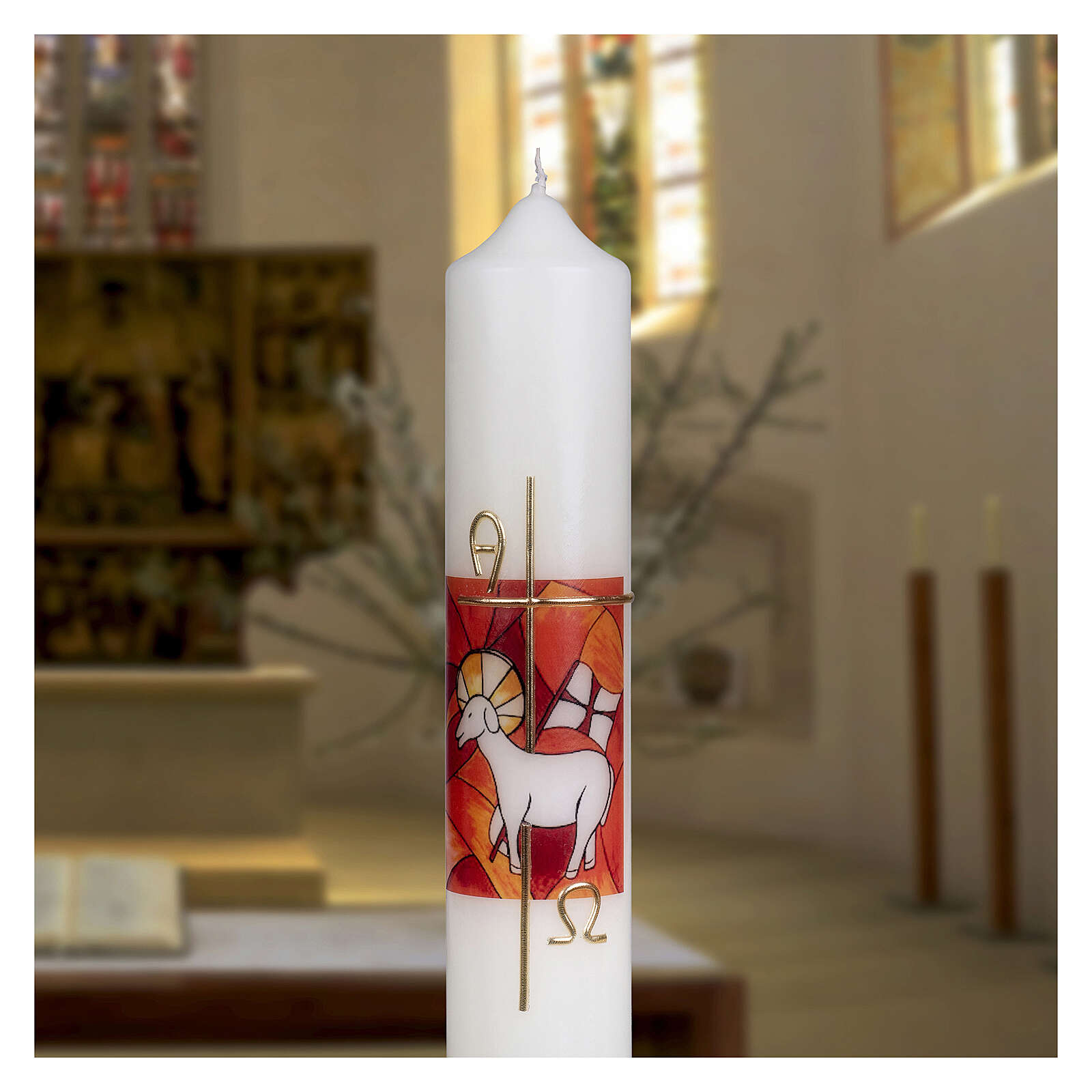 Hand-decorated candle depicting the Lamb of God with a flag on a red background. The design is enriched by a golden cross and the letters Alpha and Omega in relief.